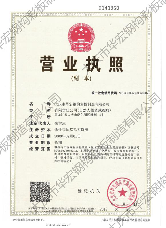 華宏鋼構(gòu)始建于2009年8月9日,總部位于大慶市薩爾圖區(qū)南一路13號(hào),現(xiàn)有大慶市華宏鋼構(gòu)彩板制造有限公司、黑龍江省華宏力安綠建科技有限公司、大慶市華宏鋼構(gòu)彩板制造有限公司長(zhǎng)春分公司、黑龍江省海森新材料科技有限公司、大慶市瑞和通螺栓廠五家工業(yè)企業(yè)形成了以彩板復(fù)合板、裝配式鋼結(jié)構(gòu)建筑、保溫材料、配件制造為主的五大生產(chǎn)基地,占地總面積 20余萬平方米,生產(chǎn)車間5萬平方米。中高層管理干部26 人,高級(jí)工程師9人,各類國家注冊(cè)執(zhí)業(yè)人員 32 人,車間技工 260人,專業(yè)安裝隊(duì)伍 10 余支,帶動(dòng)就業(yè) 500